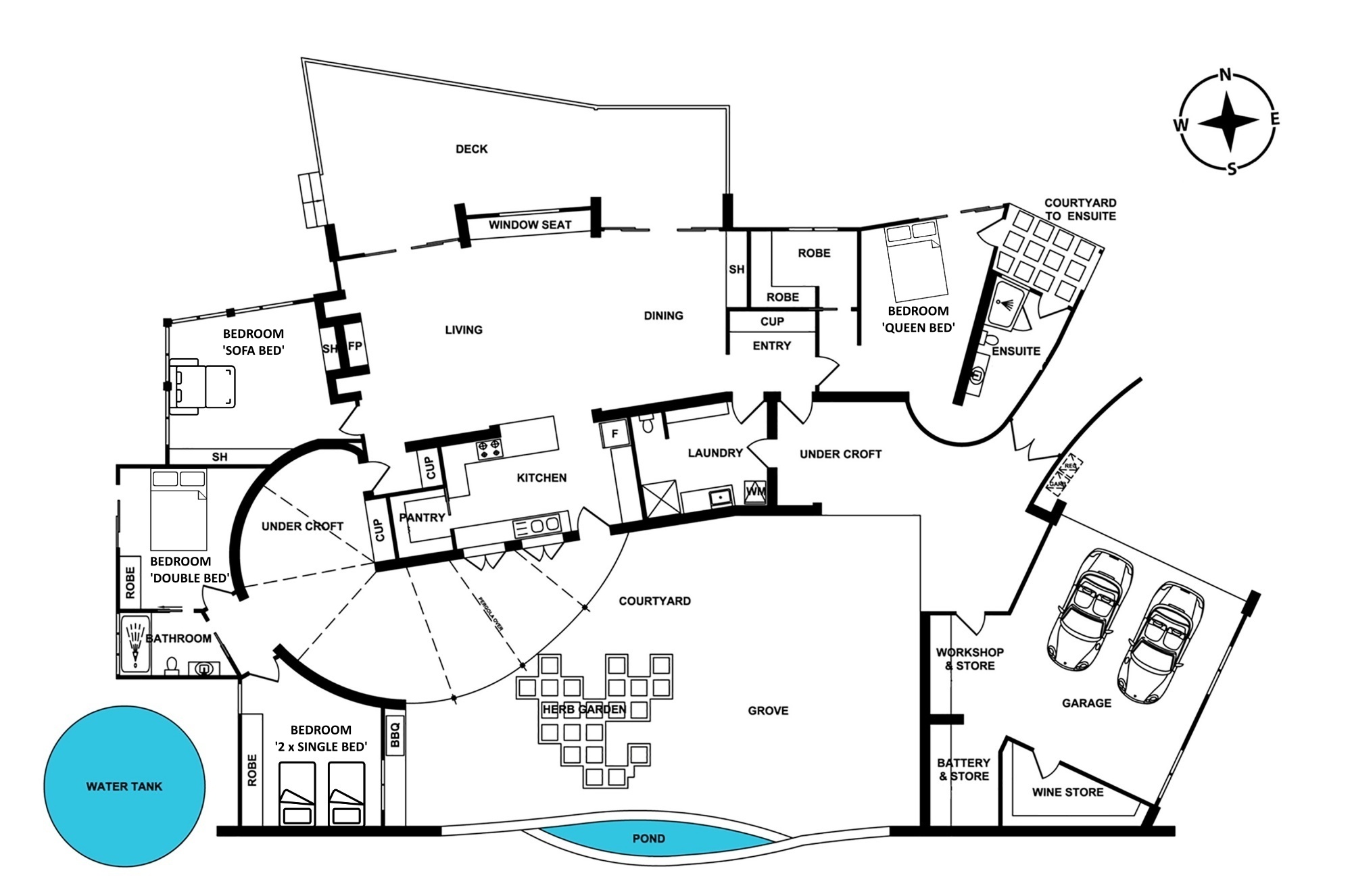 Sustainability sits at the heart of the property. Built in line with biodynamic principles, the house is completely off grid, powered by solar energy and supported by rainwater tanks and a modern septic system - offering a refined, eco-conscious stay without compromise.