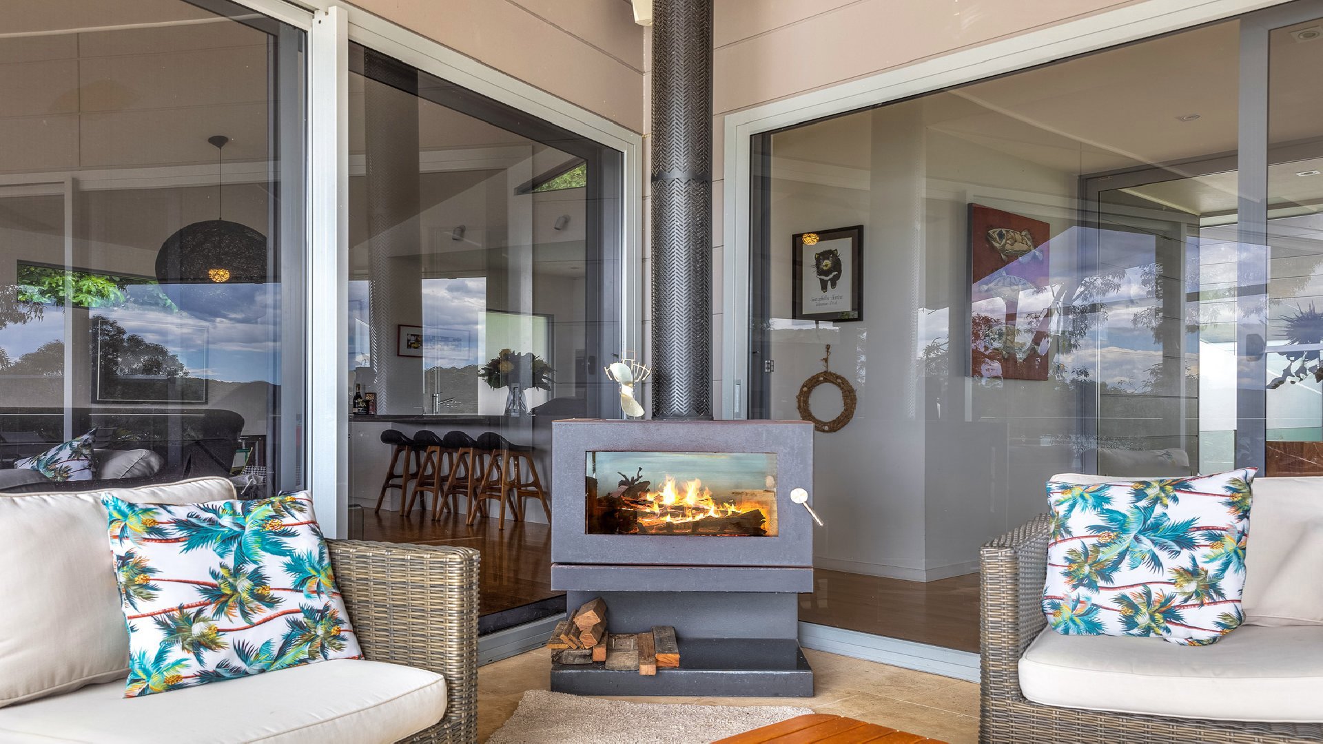 - Large covered, travertine tiled balcony, complete with outdoor seating, Weber family Q and wood fired combustion heater along with the 180 degree large sliding doors that give for an indoor-outdoor feel.