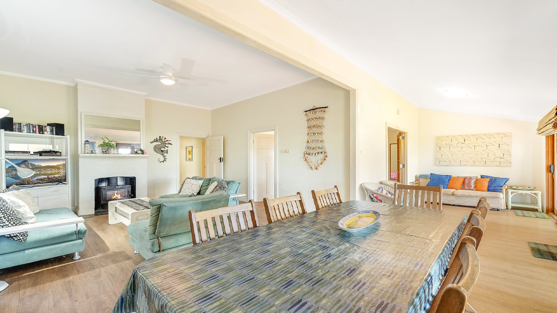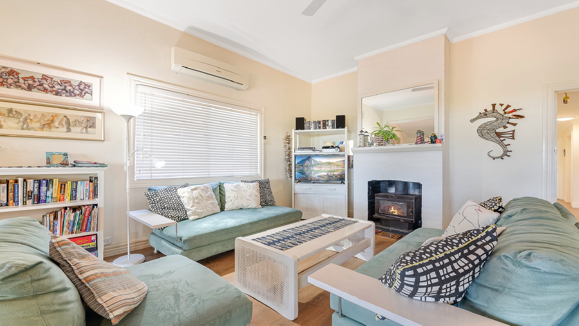 - Living area with TV, DVD player, cosy lounges, fireplace